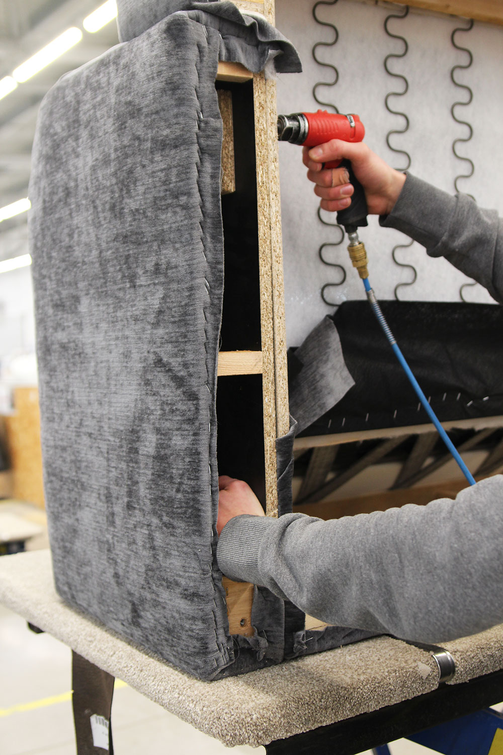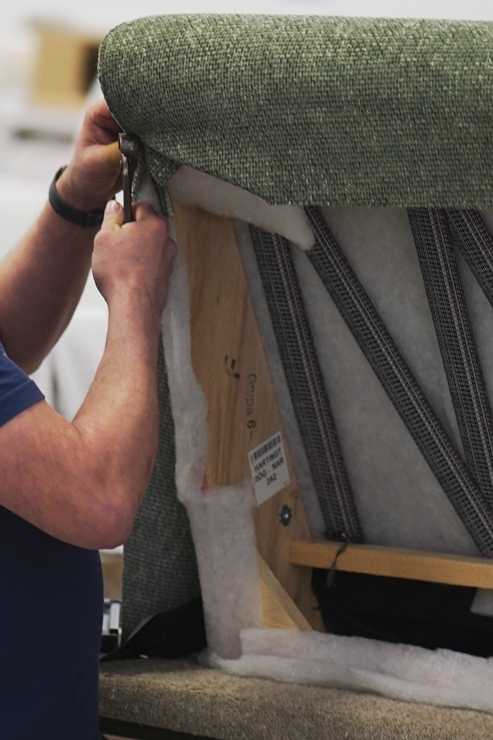 Notre propre atelier de menuiserie, notre atelier de tapisserie, notre salle de coupe et notre atelier de couture nous permettent de créer chaque pièce avec un contrôle total de la qualité. Une équipe d'employés expérimentés s'occupe de chaque détail - de la construction à la couture finale.