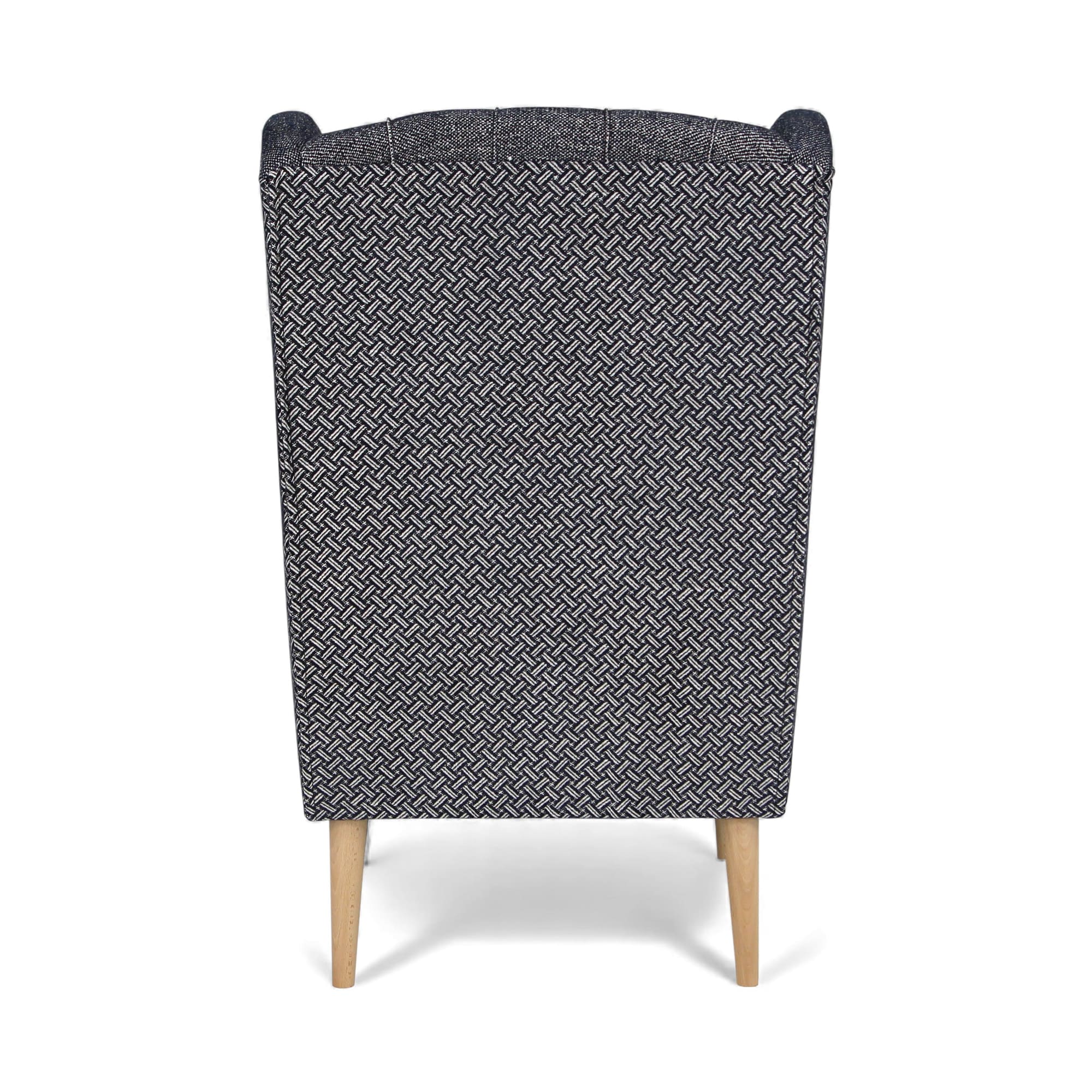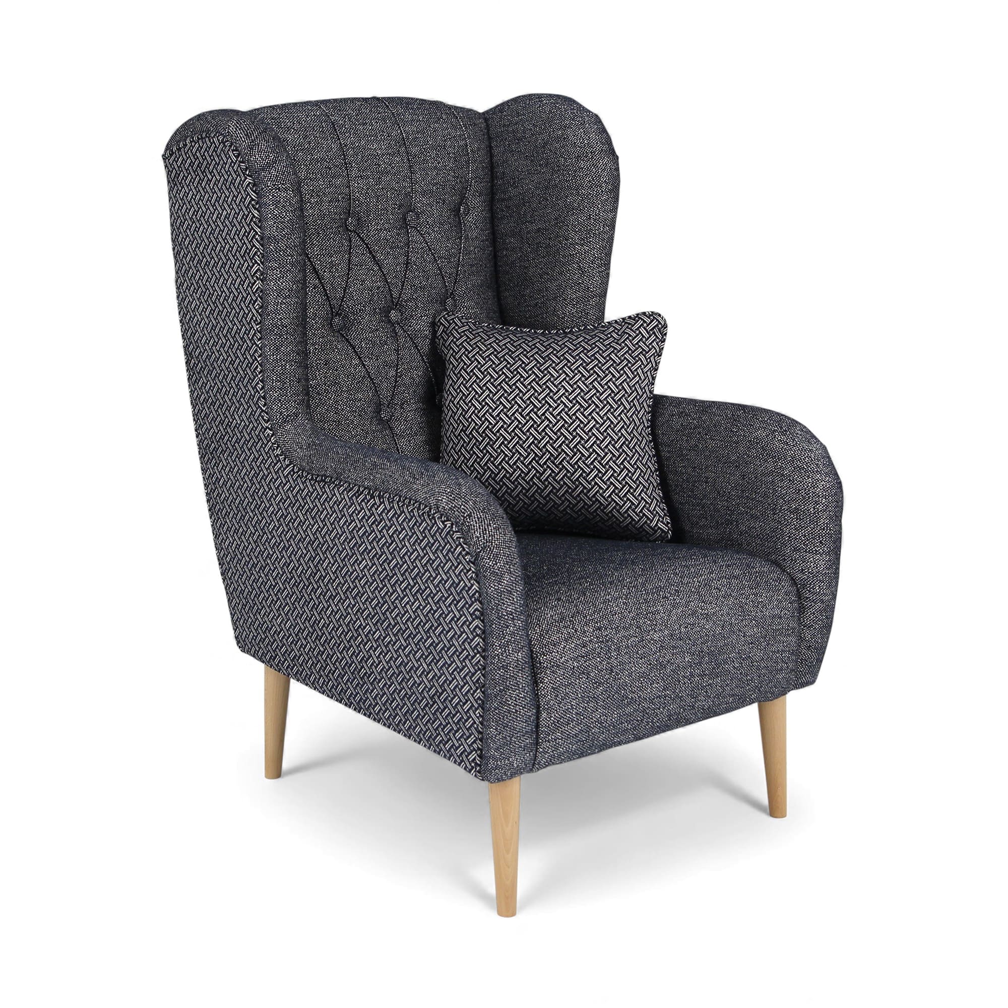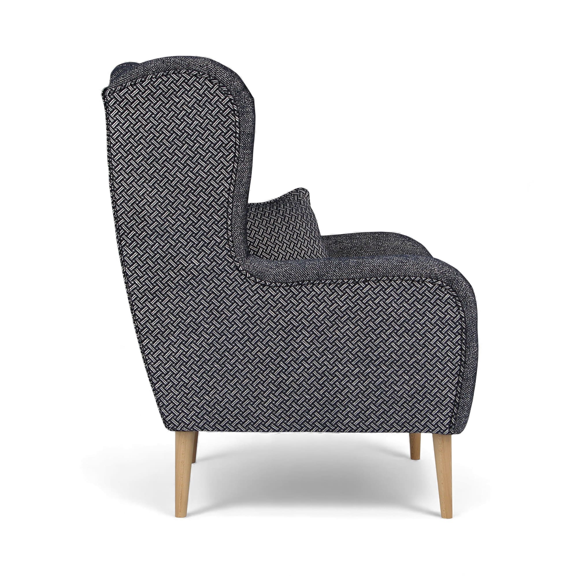 Le fauteuil est autoportant – le dossier est également revêtu de tissu – et peut donc être placé n’importe où dans la pièce, sans être nécessairement adossé à un mur. Le montage est rapide et extrêmement facile, puisqu’il se limite à visser les pieds en bois, disponibles en trois couleurs : naturel, marron et noir. Le tissu du fabricant renommé Lech Fabrics a un grammage élevé (270 g/m²) et une résistance à l’abrasion impressionnante allant jusqu’à 81 000 cycles Martindale, ce qui le rend idéal pour les intérieurs domestiques et commerciaux à usage intensif.
